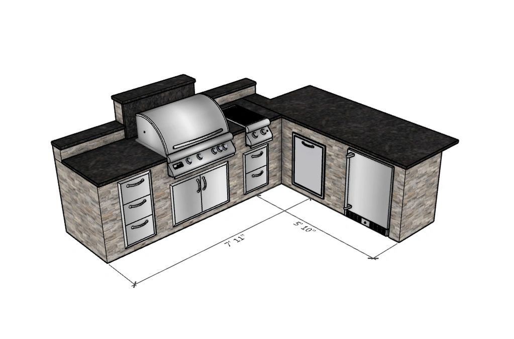 This outdoor kitchen features a durable 6005 T5 aluminum frame with a lifetime structural warranty, raised backslash behind the grill, natural stone siding, counter height bar and a Level 1 granite countertop.