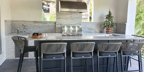 This parallel-shaped outdoor kitchen is the star of the show. The design features a cooking counter paired with an island bar that comfortably seats six. The layout is beautifully symmetrical, with triple drawers and a trash drawer on each side of the grill. To address smoke ventilation under the lanai, a rear-exhaust vent hood was added, offering both functionality and sleek aesthetics.