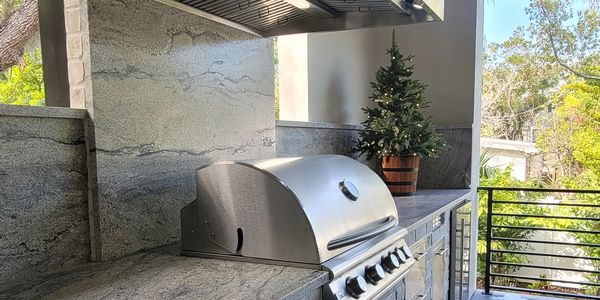To address ventilation issues under the lanai, we decided to incorporate a vent hood into this outdoor kitchen. While it appears that the vent extends all the way up to the roof and beyond, the vent actually exhausts fumes to the rear. This clever design creates a sleek, seamless look while effectively managing grill fumes.