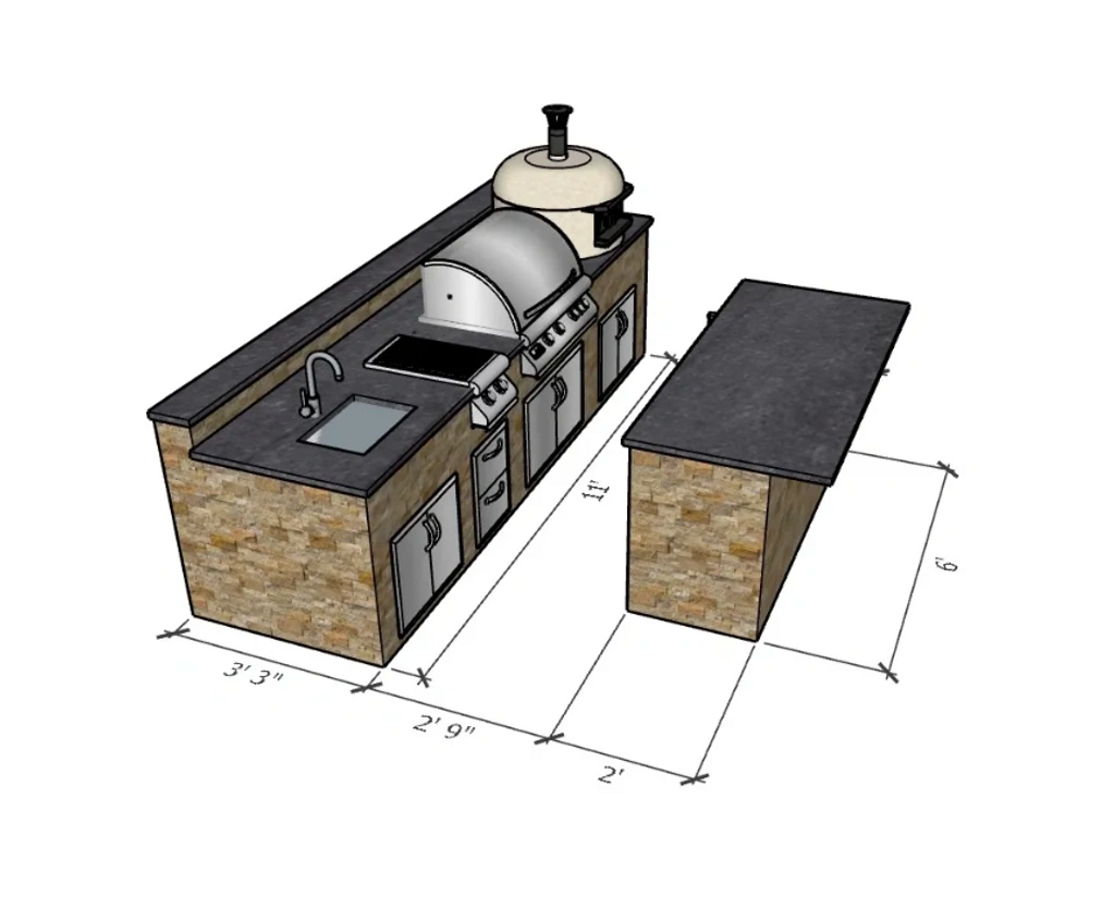 This outdoor kitchen features a durable 6005 T5 aluminum frame with a lifetime structural warranty, natural stone siding, counter height bar and a Level 1 granite countertop.