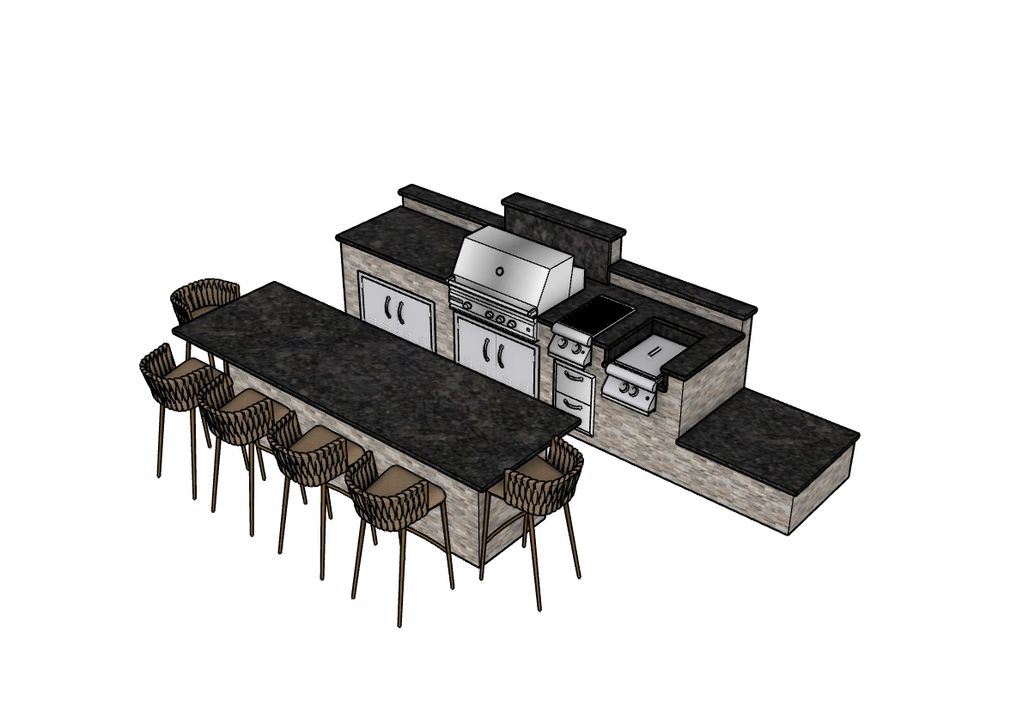 This outdoor kitchen features a durable 6005 T5 aluminum frame with a lifetime structural warranty, natural stone siding, counter height bar, and a Level 1 granite countertop. Outfitted with TrueFlame components for lasting performance and style: